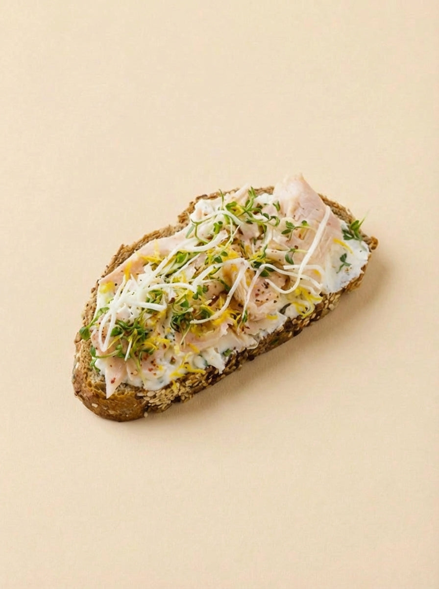 Schnittlauchquark, Forelle, Zitronenzeste, Kresse, Kren, Salz & Pfeffer