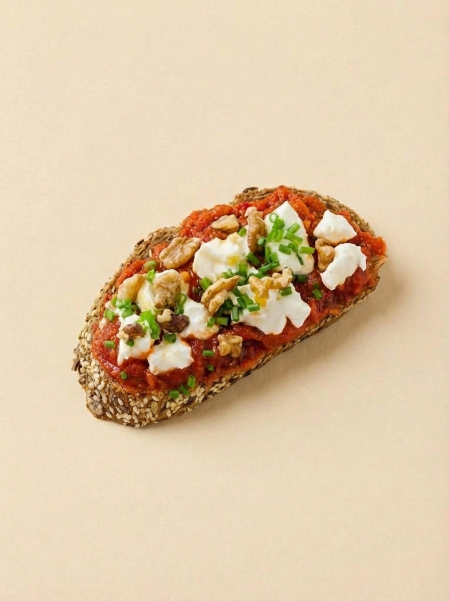 Tomatencreme, Ziegenkäse, Honig, Walnüsse, Schnittlauch
